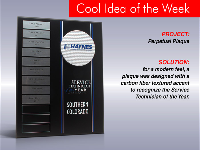 For a modern feel, a plaque was designed with a carbon fiber textured accent to recognize the "Service Technician of the Year".