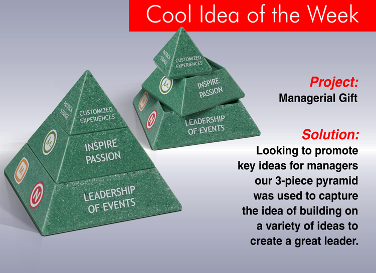 Looking to promote key ideas for managers, our 3-piece pyramid was used to capture the idea of building on a variety of ideas to create a great leader.