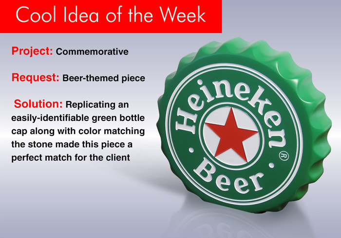 Replicating an easily-identifiable green bottle cap, along with color matching the stone, made this piece the perfect match for the client.