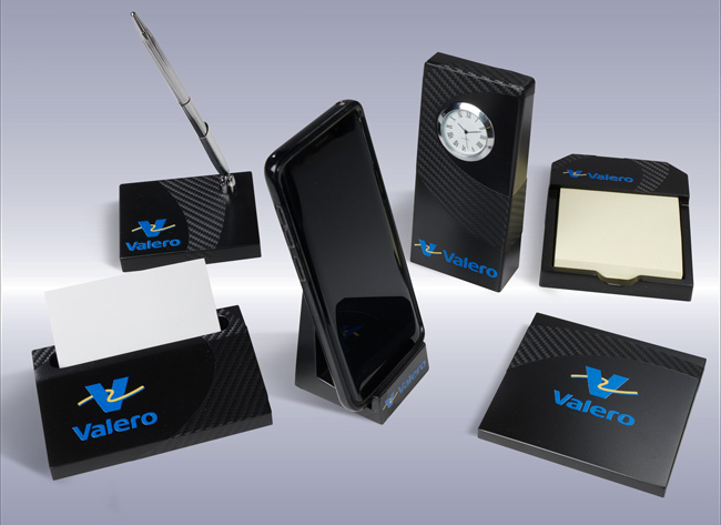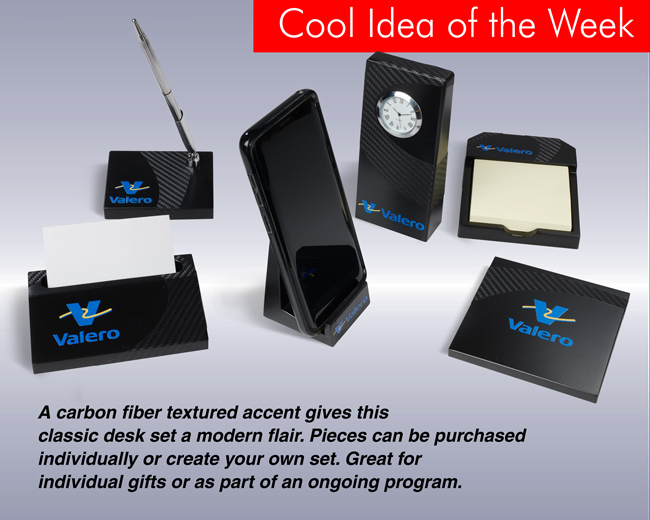 A carbon fiber textured accent gives this classic desk set a modern flair. Pieces can be purchased individually or create your own set. Great for individual gifts or as part of an ongoing program.