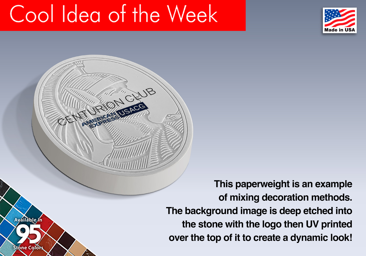 This paperweight is an example of mixing decoration methods. The background image is deep etched into the stone with the logo then UV Printed over the top of it to create a dynamic look!