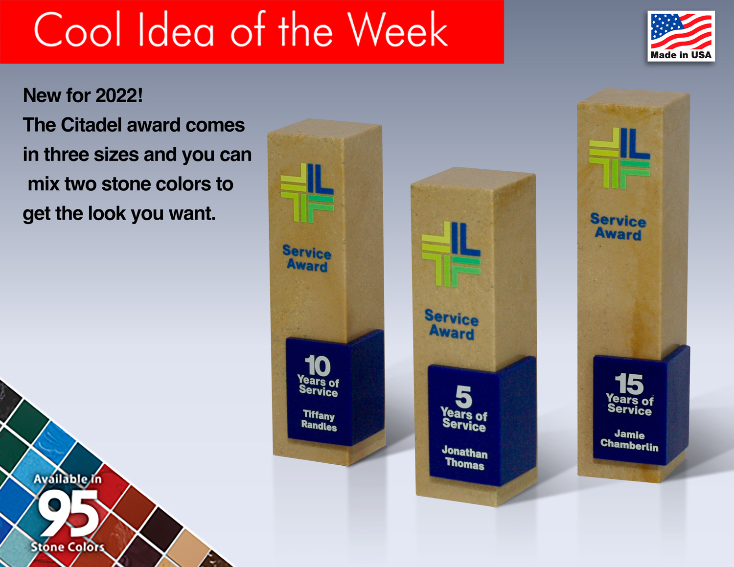 New for 2022! The Citadel award comes in three sizes and you can mix two stone colors to get the look you want.