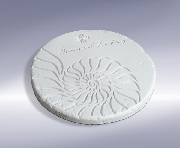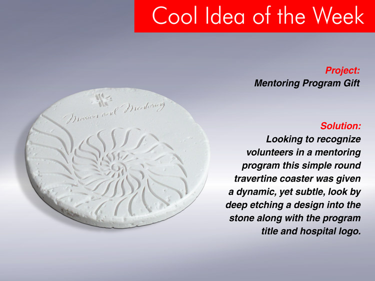 Looking to recognize volunteers in a mentoring program, this simple round travertine coaster was given a dynamic, yet subtle look by deep etching a design into the stone along with the program title and logo.