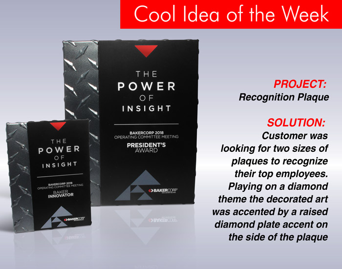 The client was looking for two sizes of plaques to recognize their top employees. Playing on a diamond theme, the decorated art was accented by a raised diamond plate accent along the side of the plaque.