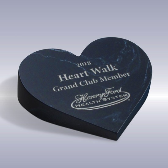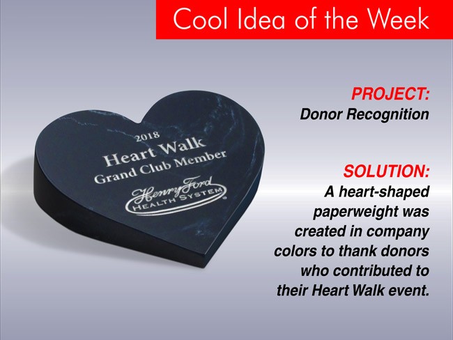 A heart-shaped paperweight was created in company colors to thank donors who contributed to their Heart Walk event.