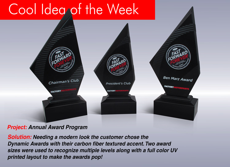 Needing a modern look, the customer chose the Dynamic Awards with their carbon fiber textured accent. Two award sizes were used to recognize multiple levels along with a full color UV printed layout to make the awards pop !