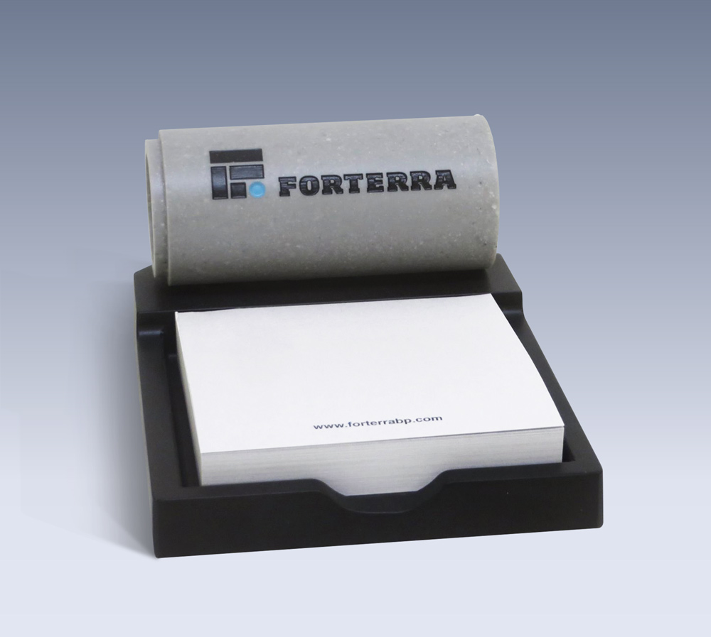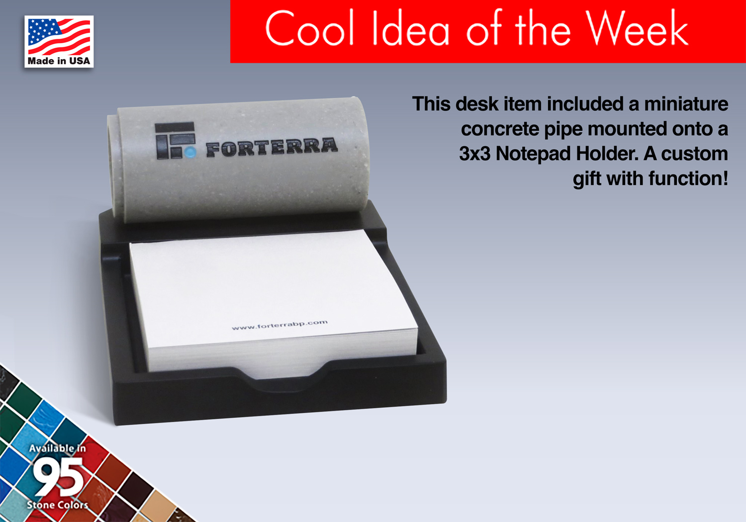 This desk item included a miniature concrete pipe mounted onto a 3x3 Notepad Holder. A custom gift with function!