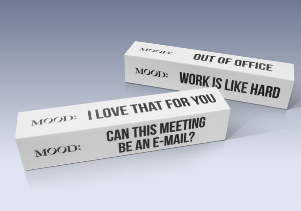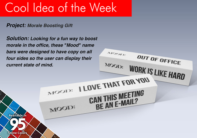 Looking for a fun way to boost morale in the office, these "mood" name bars were designed to have copy on all four sides so the user can display their current state of mind.