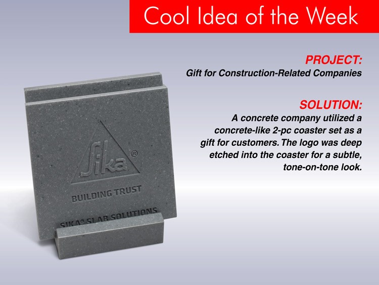 A concrete company utilized a concrete-like 2 piece coaster set as a gift for customers. The logo was deep etched into the coaster for a subtle, tone-on-tone look.