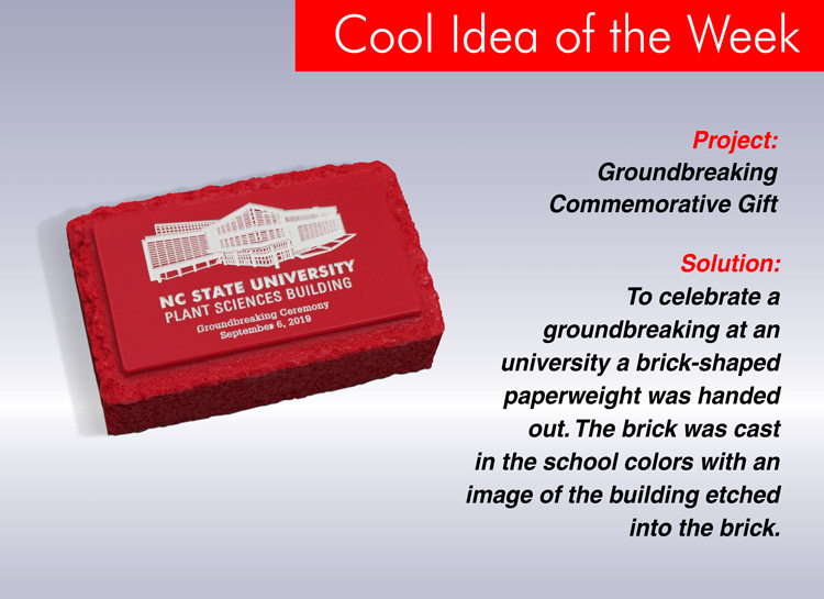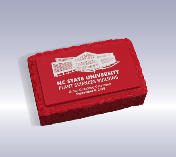 To celebrate a groundbreaking at an university a brick-shaped paperweight was handed out. The brick was cast in the school colors with an image of the building etched into the brick.
