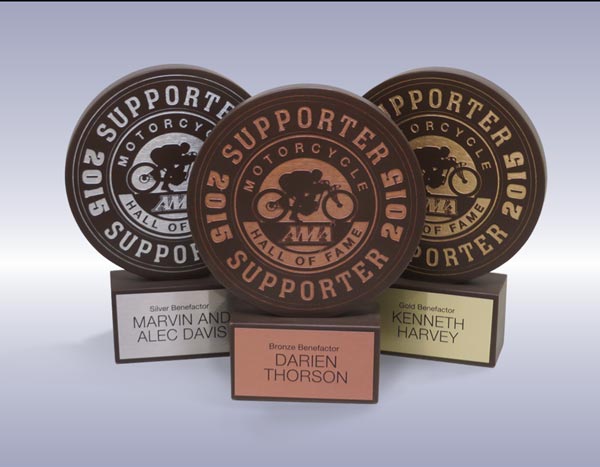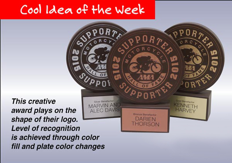 This creative award plays on the shape of their logo. Level of recognition is achieved through color fill and plate color changes.