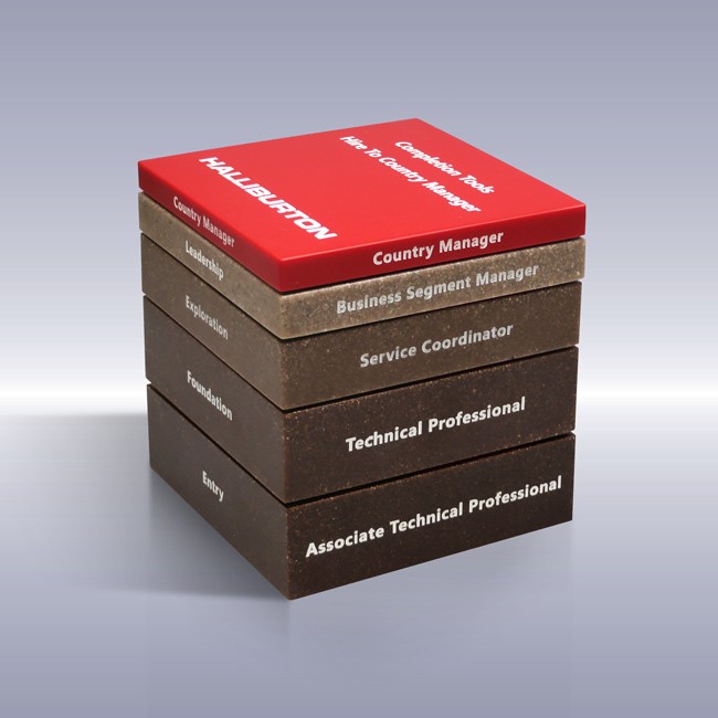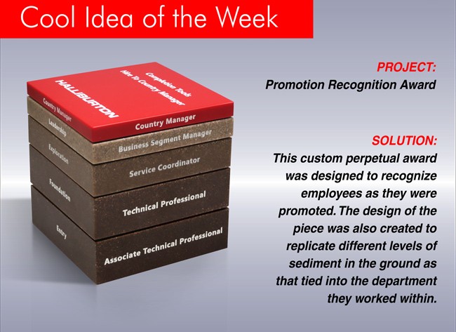 This custom perpetual award was designed to recognize employees as they were promoted. The design of the piece was also created to replicate different levels of sediment in the ground as that tied to the department they worked within.