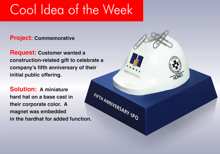 A miniature hard hat on a base cast in their corporate color. A magnet was embedded in the hard hat for added function.