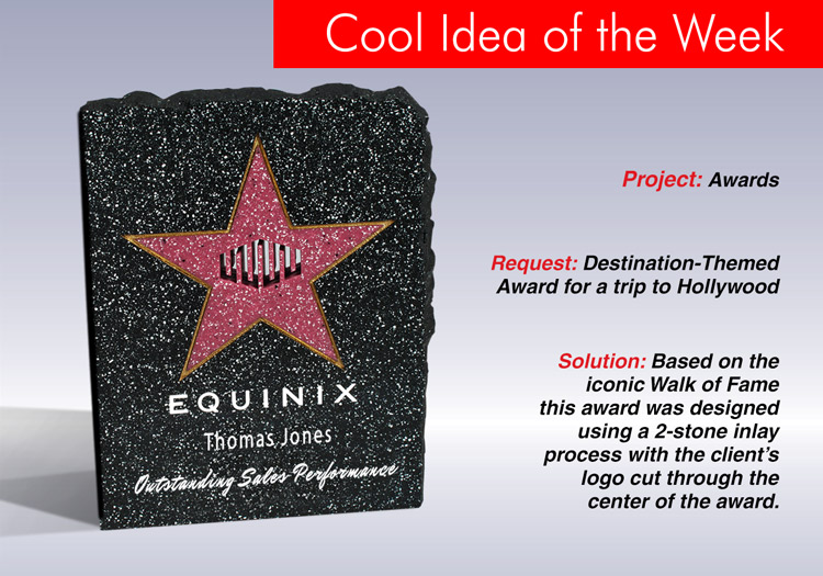Based on the iconic Walk Of Fame, this award was designed using a 2-stone inlay process with the client's logo cut through the center of the award.