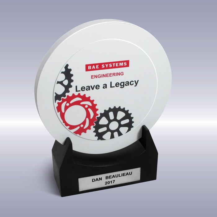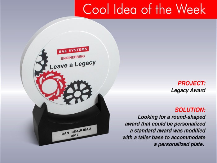 Looking for a round-shaped award that could be personalized a standard award was modified with a taller base to accommodate a personalized plate.