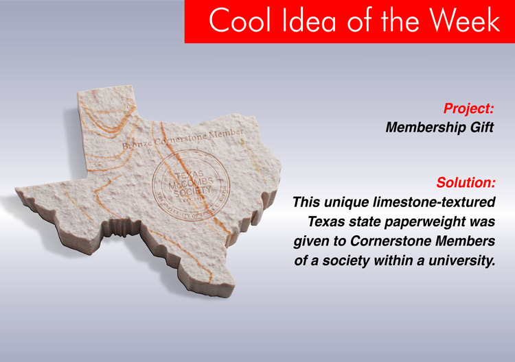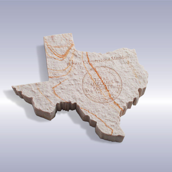 This unique limestone textured Texas shaped paperweight was given to Cornerstone Members of a society within a university.