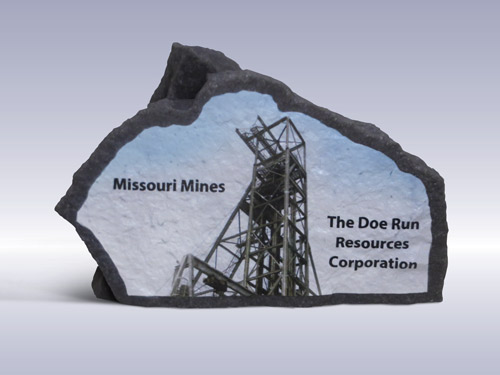 This desk-sized rock was cast in a black stone color with a full color UV-Print shaped to fit the rock commemorating one of the mines utilized by the company.