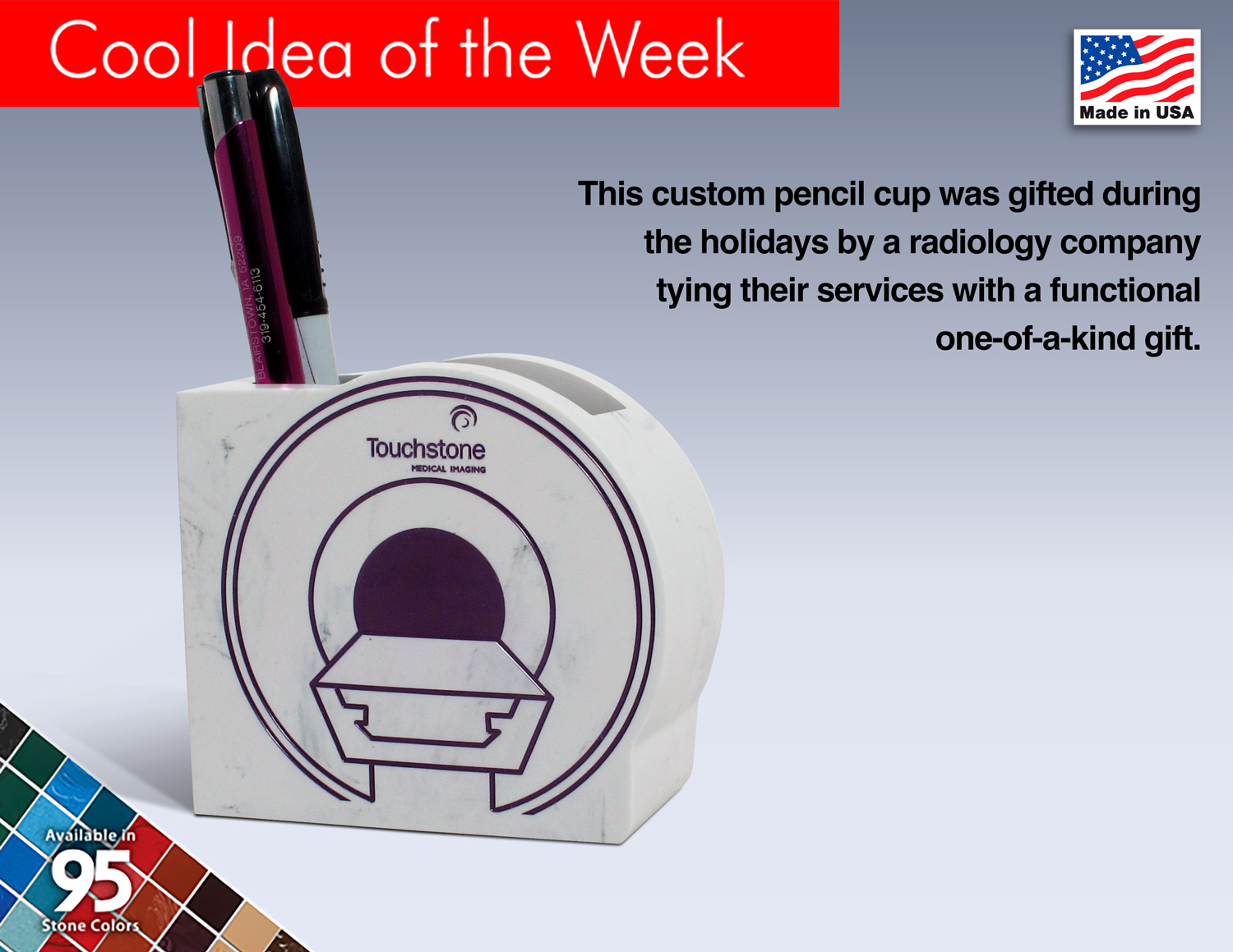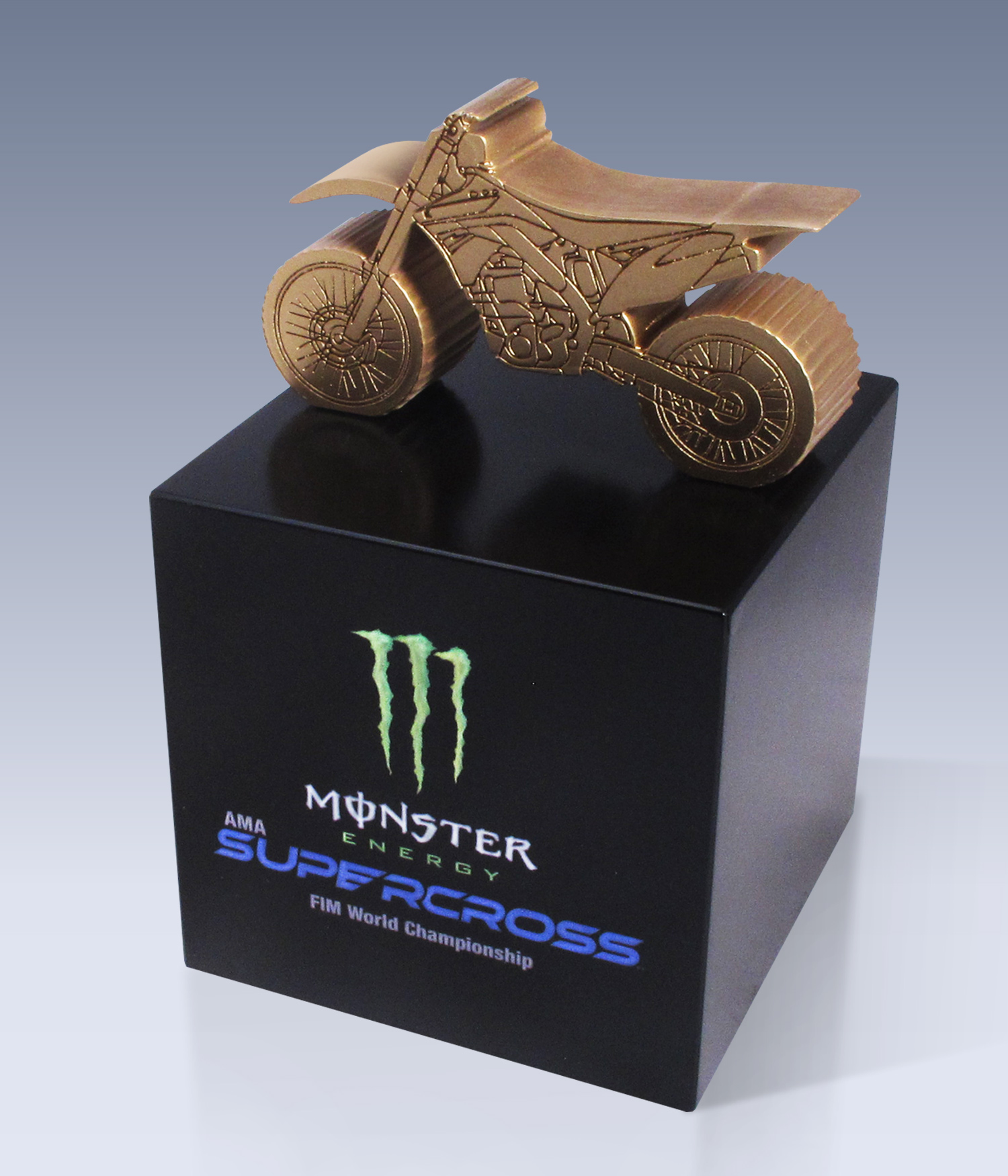 A 2-D cutout of an off-road motorcycle was coated metallic gold and mounted to a 4-inch cube base of black onyx. The copy was UV printed in full color.