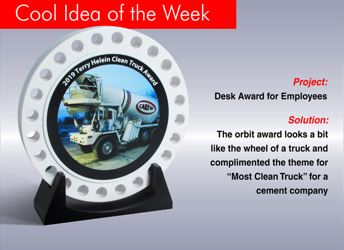 The Orbit Award looks a bit like a wheel of a truck and complimented the theme for "Most Clean Truck" for a cement company.