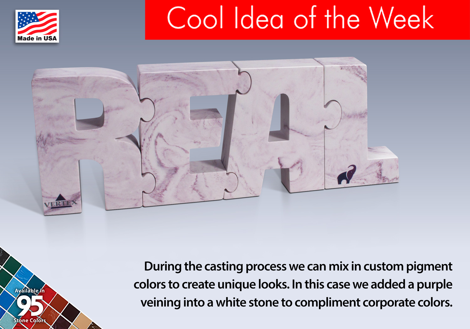 During the casting process we can mix in custom pigment colors to create unique looks. In this case, we added a purple veining into a white stone to compliment corporate colors.