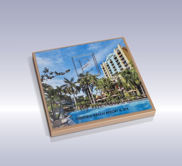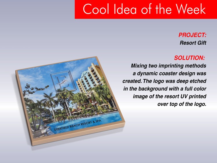 Mixing two imprinting methods, a dynamic coaster design was created. The logo was deep etched in the background with a full color image of the resort UV Printed over the top of the logo.