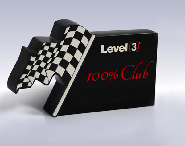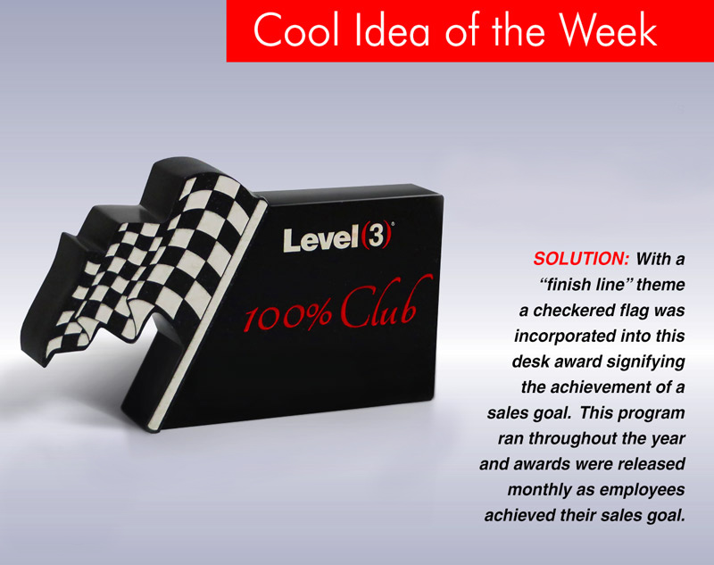 With a "finish line" theme, a checkered flag was incorporated into this desk award signifying the achievement of a sales goal. This program ran throughout the year and awards were released monthly as employees achieved their sales goals.