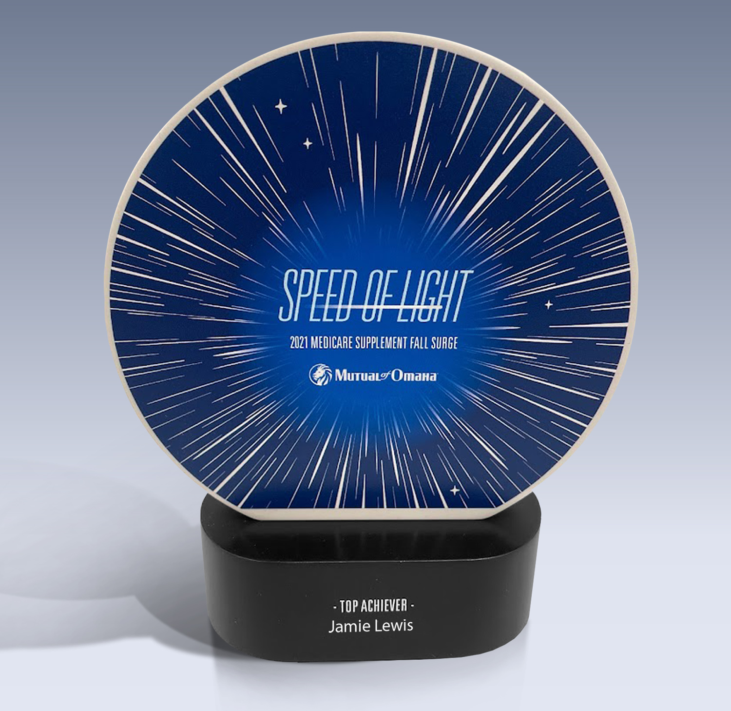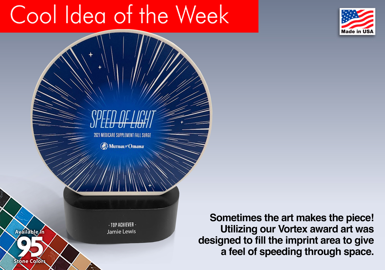 Sometimes the art makes the piece! Utilizing or Vortex award, art was designed to fill the imprint area to give a feel of speeding through space.