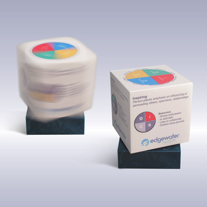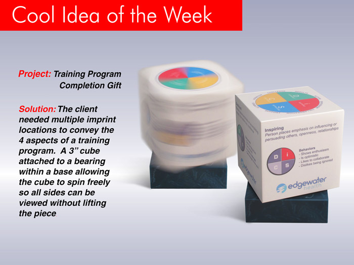 The client needed multiple imprint locations to convey the 4 aspects of a training program. A 3 inch cube was attached to a bearing within a base allowing the cube to spin freely so all sides can be viewed without lifting the piece.