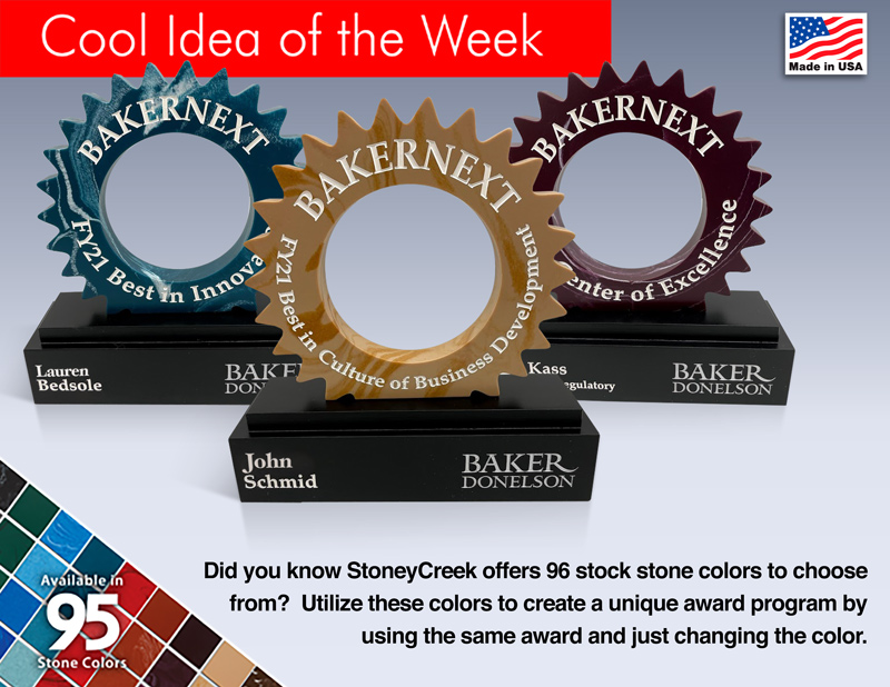 Choose from nearly 100 stock stone colors to create a unique award program by using the same award and just changing the color.