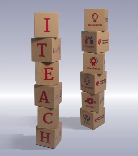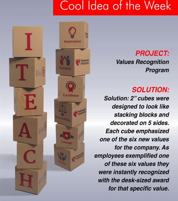 2” cubes were designed to look like stacking blocks and decorated on 5 sides. Each cube emphasized one of the six new values for the company. As employees exemplified one of these six values they were instantly recognized with the desk-sized award for that specific value.