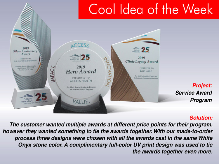 The customer wanted multiple awards at different price points for their program, however they wanted something to tie the awards together. With our made-to-order process, three designs were chosen with all the awards cast in the same White Onyx stone color. A complimentary full color UV print design was used to tie the awards together even more.