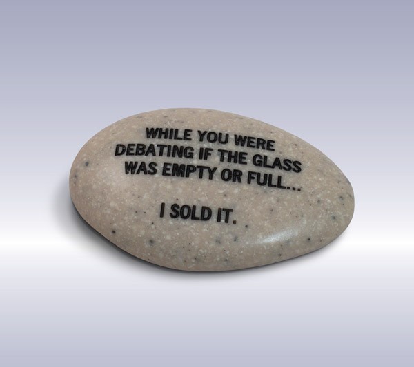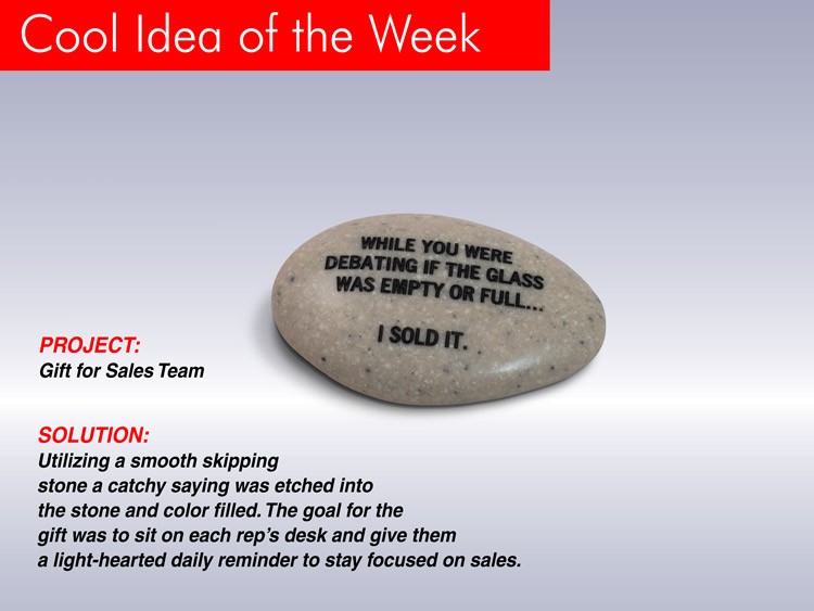 Utilizing a smooth skipping stone, a catchy saying was etched into the stone and color filled. The goal for the gift was to sit on each Rep's desk and give them a light-hearted daily reminder to stay focused on sales.