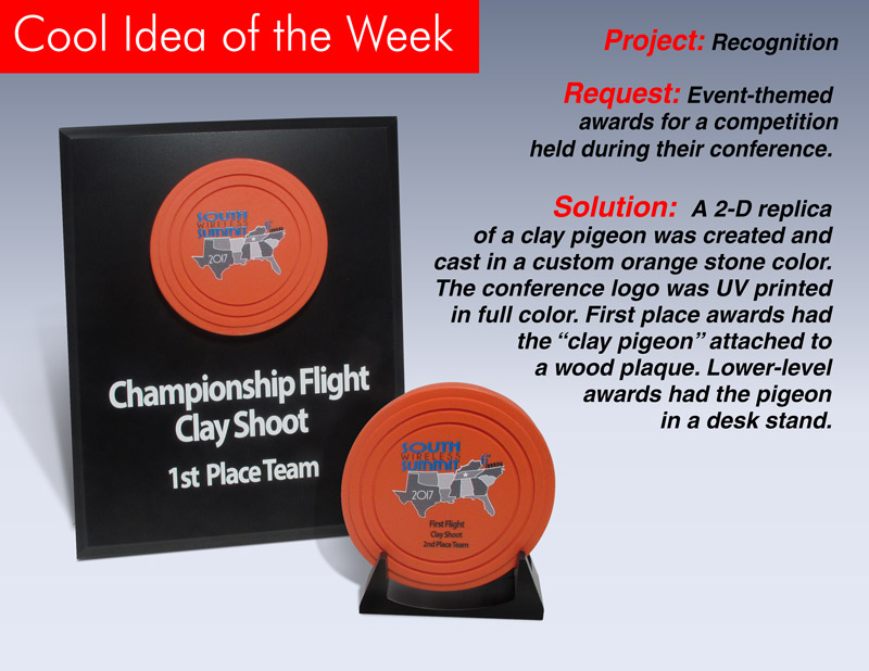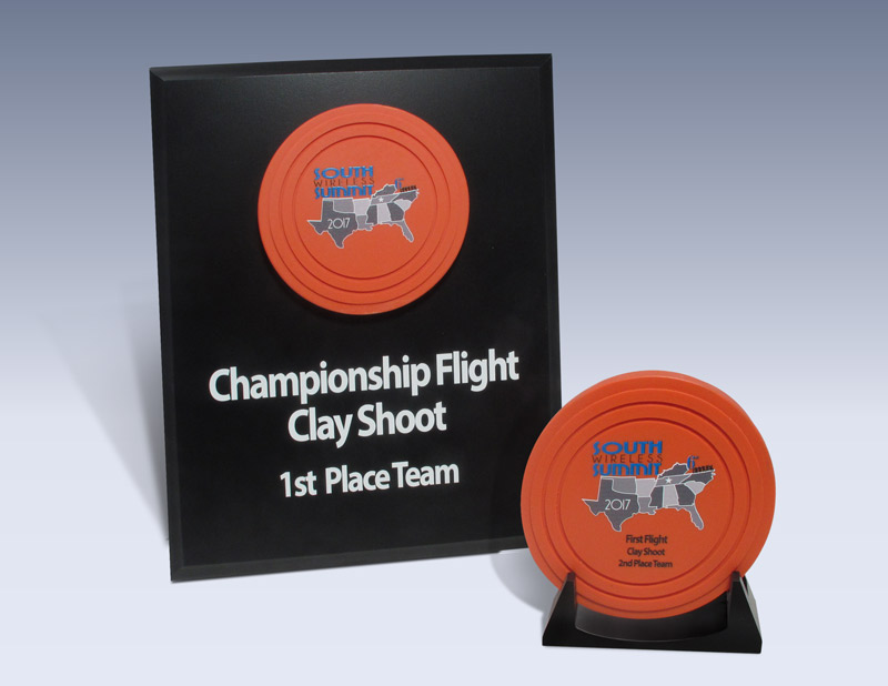 A. 2-D replica of a clay pigeon was created and cast in a custom orange stone color. First place awards had the "clay pigeon" attached to a wood plaque. Lower level awards had the pigeon in a desk stand.