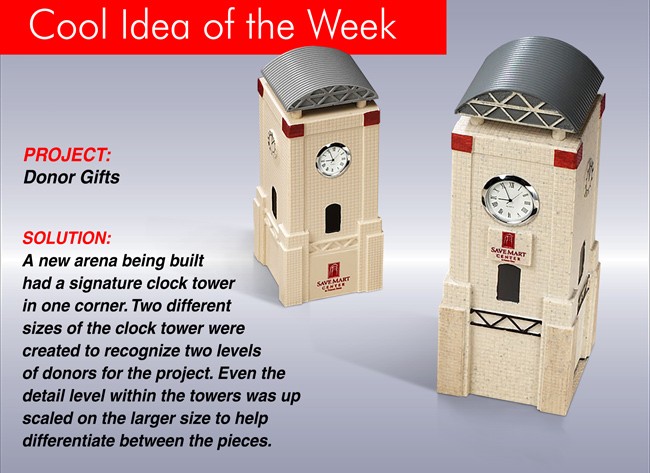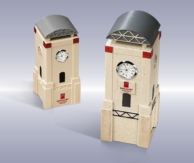 A new arena being built had a signature clock tower in one corner. Two different sizes of the clock tower were created to recognize two levels of donors for the project. Even the detail level within the towers was up scaled on the larger size to help differentiate between the pieces.