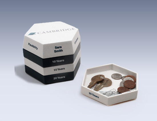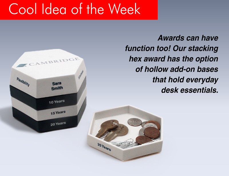 Our stacking hex award has the option of hollow add-on bases that hold everyday desk essentials.