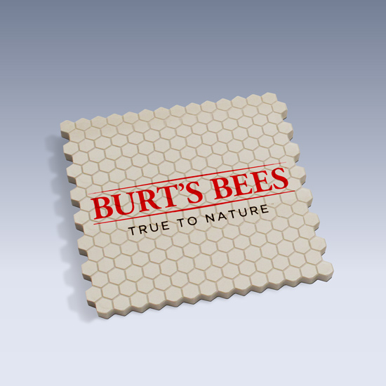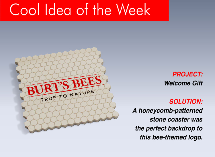 A honeycomb-patterned stone coaster was the perfect backdrop to this bee-themed logo.