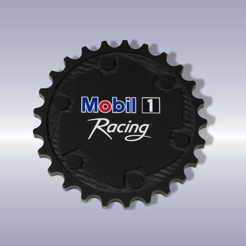 This gear coaster mixes a deep etched gear detail with a large imprint area to create a dynamic looking desk piece.