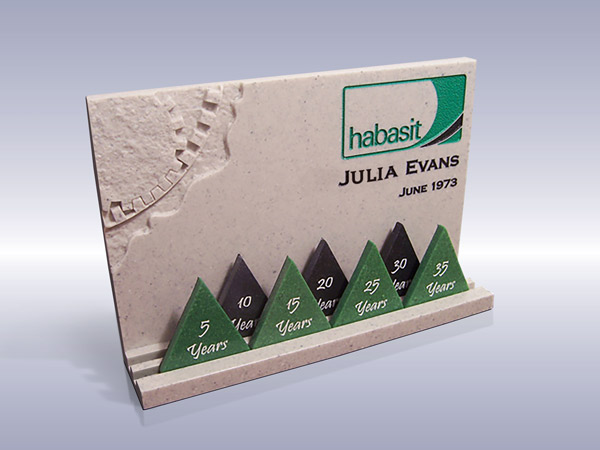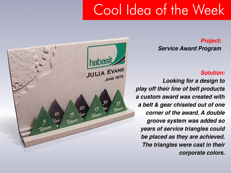Looking for a design to play off their line of belt products, a custom award was created with a belt & gear chiseled out of one corner of the award. A double groove system was added so years of service triangles could be placed as they are achieved. The triangles were cast in their corporate colors.