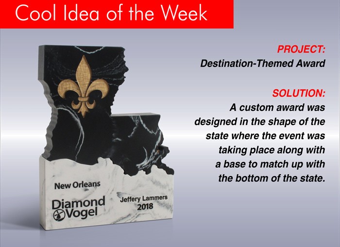A custom award was designed in the shape of the state where the event was taking place along with a base to match up with the bottom of the state.