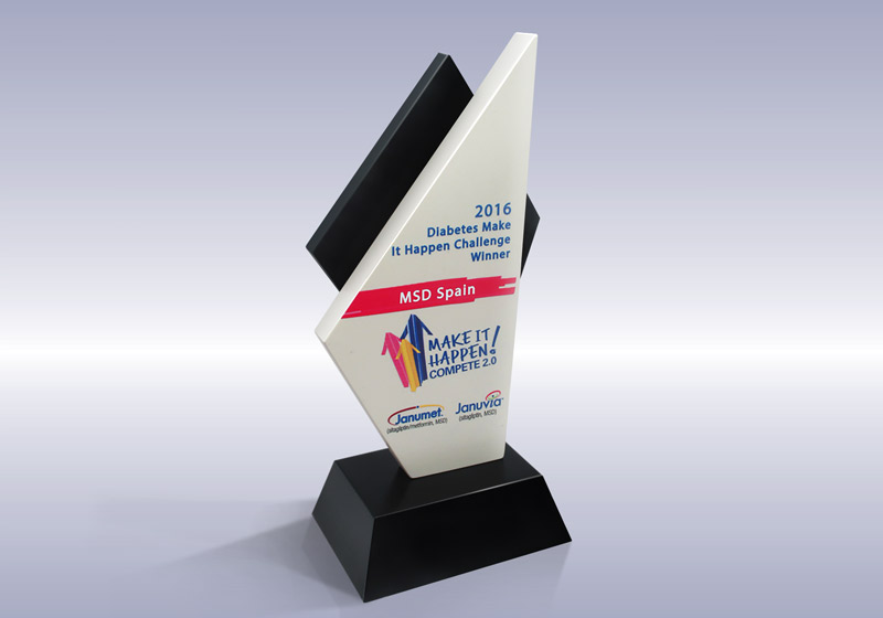 Layering uniquely cut diamond shapes on a tapered base gave a dimensionally and uniquely shaped award. Decorated with a full color UV print.