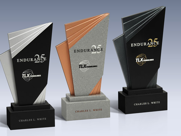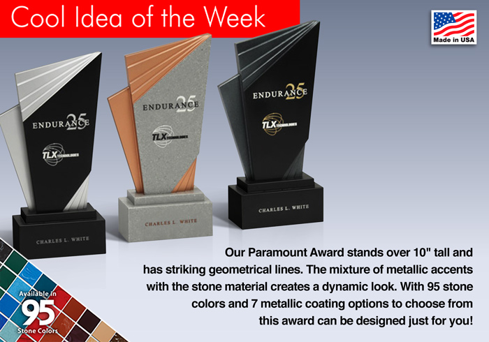 Our Paramount Award stands over 10 inches tall and has striking geometrical lines. The mixture of metallic accents with the stone material creates a dynamic look.