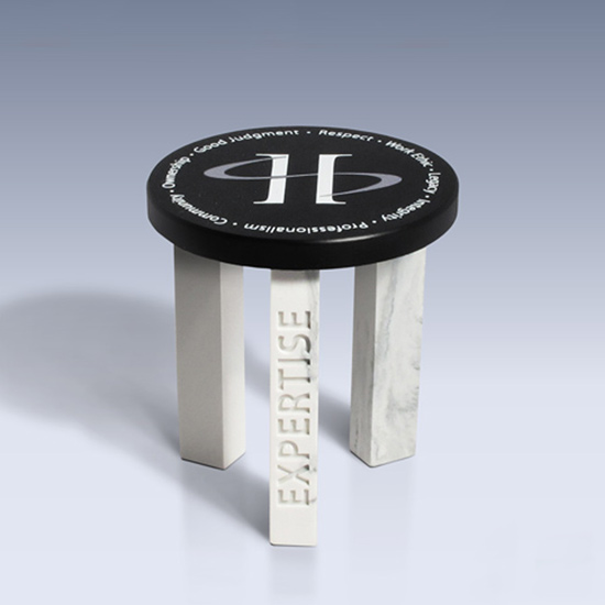 Looking to emphasize what the company is built on, a 3-legged stool was created with the core values etched on the legs and the supporting values printed around the logo on the top.