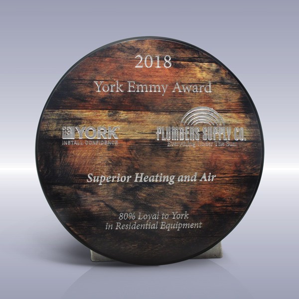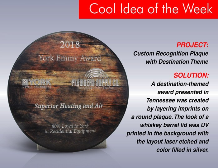 A destination-themed award presented in Tennessee, was created by layering imprints on a round plaque. The look of a whiskey barrel lid was UV printed in the background with the layout laser etched and color filled in silver.